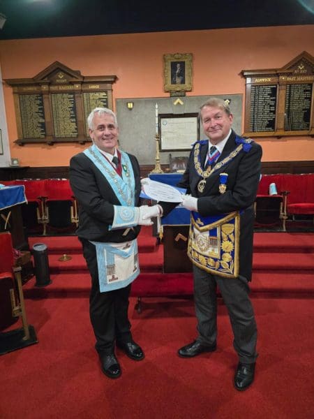 The occasion marked the Installation of Worshipful Brother Stephen Young for a second consecutive year as Master of Coquetdale Lodge, Alnwick, conducted by his father, Worshipful Brother Allan Young, the Immediate Past Master.