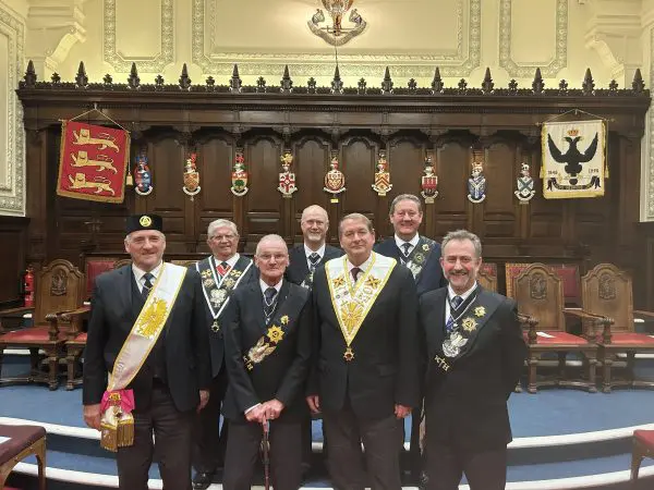 The group was led by the Very Illustrious Inspector General for Northumberland, Steve Read, accompanied by the District Recorder, Ill. Bro. Barrie Whittaker 32°. Joining them were Illustrious Brethren Kevin Stannard and Paul Ryder, both of Royal Kent Chapter No. 8, together with Ill. Bro. Allan Carpenter of Northumbria Chapter No. 1070. They attended to receive promotion in the Order, witnessed by Ill. Bros. Philippe Pagès and Ray Dryden.