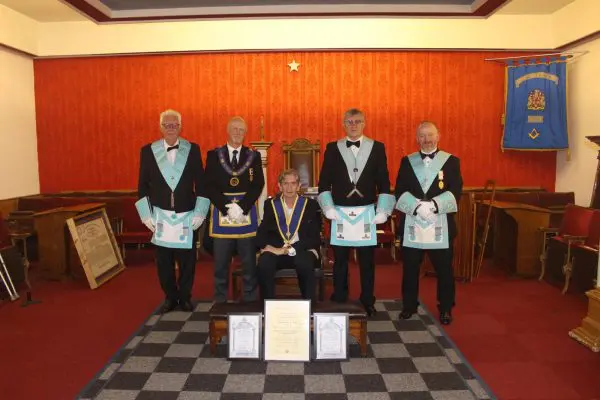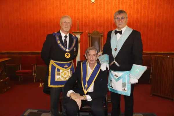 WBro Graeme with the Provincial representative and Worshipful Master during the 50-year celebration meeting at Newcastle upon Tyne Lodge No. 24.